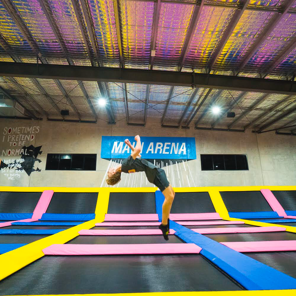 Full from wall to wall of more than 40 interconnected trampolines, a giant tumbling mat and a massive cushy airbag to throw all your biggest moves into and capture it for your friends. Jump for days in our main stage.